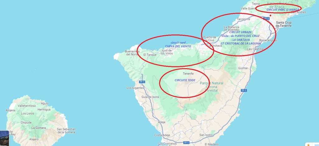 Le club Bivouac permet de rencontrer des amis qui ont la même passion et avec lesquels il est possible d’organiser tous types de voyages. Ténérife en est le parfait exemple. En road trip, voici les 4 régions visitées ci-dessous sur la carte. Lorsque le camping-car est hiverné, Tenerife est une destination au soleil facilement organisable jusqu’à 4 équipages, 2 véhicules (gros problèmes de stationnement dans les villes). Les incontournables sont : le TEIDE (voir la vidéo), le Parc naturel d’Anaga avec ses 2300 km de randonnées, la côte Nord Ouest avec ses piscines naturelles.