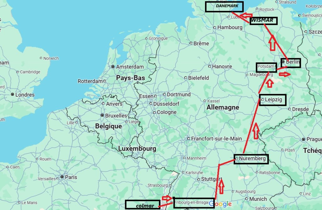Le circuit compte 5000 km en passant par l’Allemagne ( Freiburg, Nuremberg, Leipzig, Potsdam et Berlin). Le retour s’est effectué par le Rhin romantique. Il est possible de rejoindre le Danemark directement sans faire le circuit par l’Allemagne.